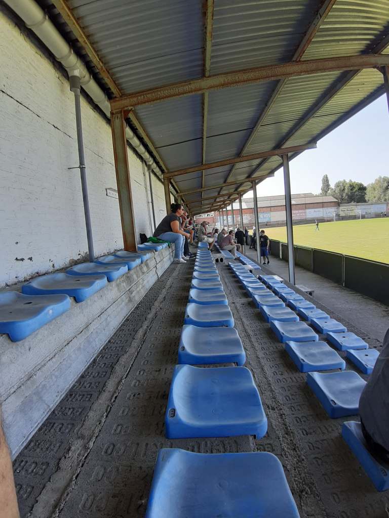 De keuze viel op FC Oxford Hemiksem. Een op het eerste zicht toffe, familiale club waar plezier voorop staat. Ze hebben een leuk onderkomen, met een oude overdekte zittribune. Veel poutrels om het dak te ondersteunen, wat me altijd aan Everton denken. Daar zat ik ooit in de tribune met een poutrel voor mijn neus, waardoor ik het ene doel niet kon zien .. Mag gezegd, het waren vuile zitjes met vooral betonstof. Achter de tribune en 1 doel gaf het stadion een echte grauwe Engelse aanblik. Magazijnen of industrie doken achter de stadionmuren omhoog. Just the way I like it. Fijn stadion!